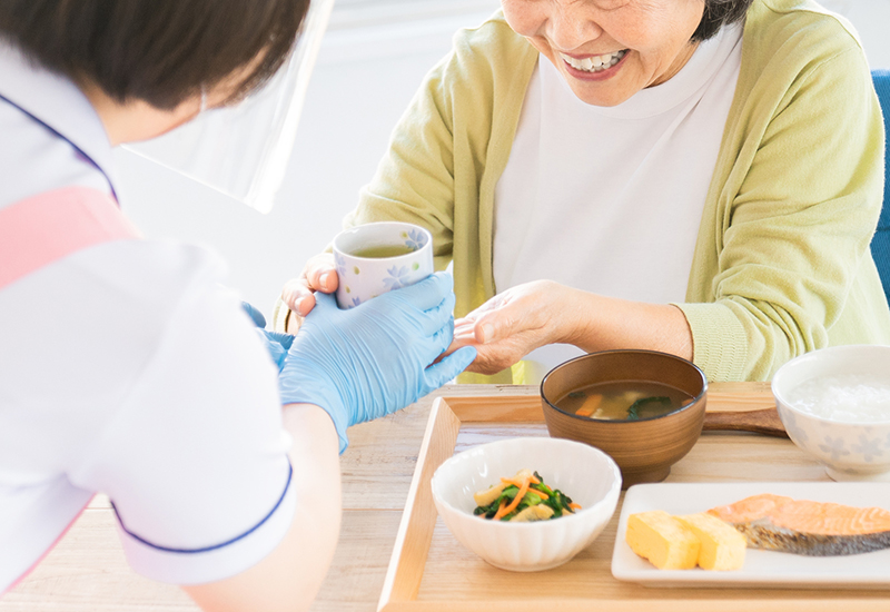 使用済みの食器やトレイを下げ、洗い物などの片付けを行い、食事やレクリエーションを行う共用スペースを清潔に保ちます。施設全体の感染症予防に心がけ、利用者様が安全かつ快適に過ごせる生活空間を維持します。