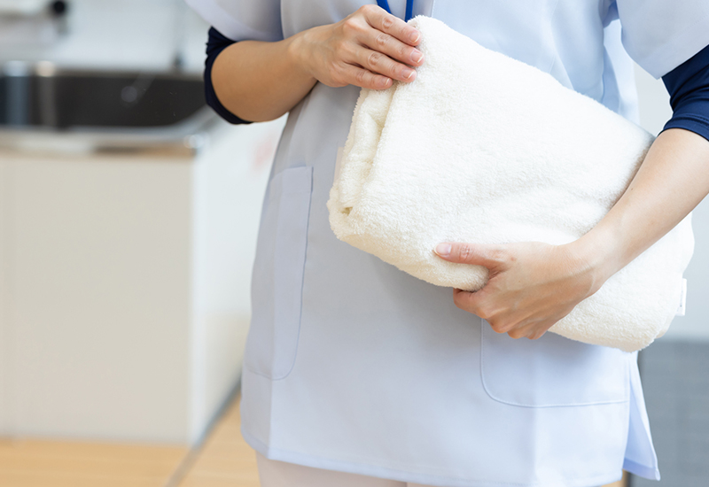 居室や共用スペース・トイレ・浴室などのゴミ回収と、利用者様が使用した汚れた衣類やシーツ・タオルなどのリネン類を回収します。また、タオル・手指消毒液・清掃用具などの消耗品の残量をチェックし、随時補充します。 - 17:00